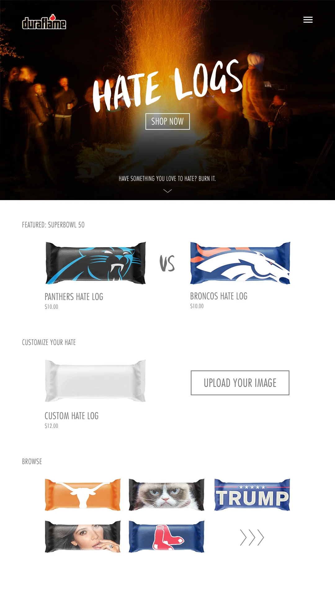 Duraflame Logs are wrapped in paper to help with easy lighting, thus creating the perfect opportunity for customization. Have something you love to hate? Burn it with a customized Hate Log. We used personal rivalries as a fun way to open a new market for Duraflame.